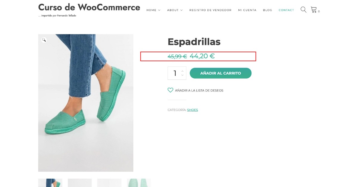 El resultado es este, mostrándose el prefijo solo en productos rebajados y justo delante del precio en oferta:
